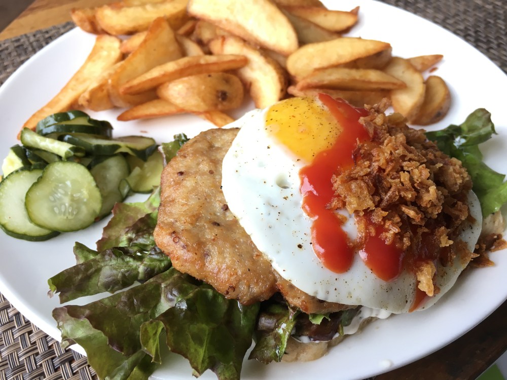 Scandinavian Style open sandwich with a pork patty and fried egg on top, served with fried potato, gherkins and crispy onion.