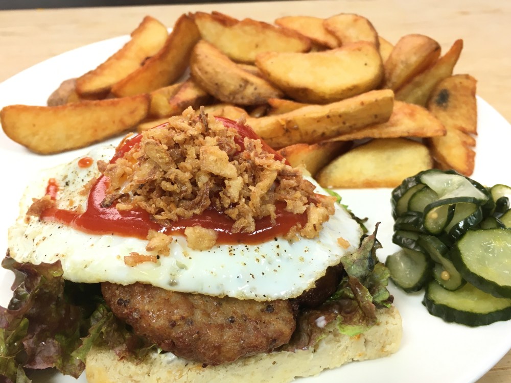 Lunch Special ! Pannbiffsmacka. It’s an open sandwich with a meat patty topped with a fried egg and crispy onion. Served on our home baked bread and with fried potato wedges and pickled gherkins on the side. It’s a classic sandwich from the ferries between south of Sweden and Denmark. Served Mon- Fri.